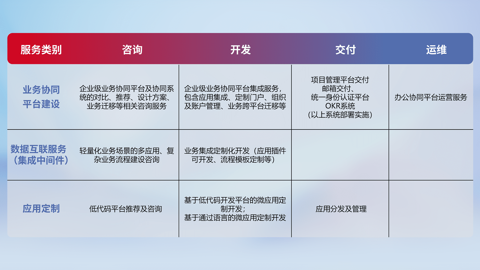 针对钉钉、、企微、、、、IDaas等平台级产品提供产品的规划、、、、方案、、、、交付、、定制化开发等服务,,实现如统一协同办公、、、、智能客户服务、、混合会议管理、、、智能数据查询、、、等业务场景,,,,实现数字化转型。。