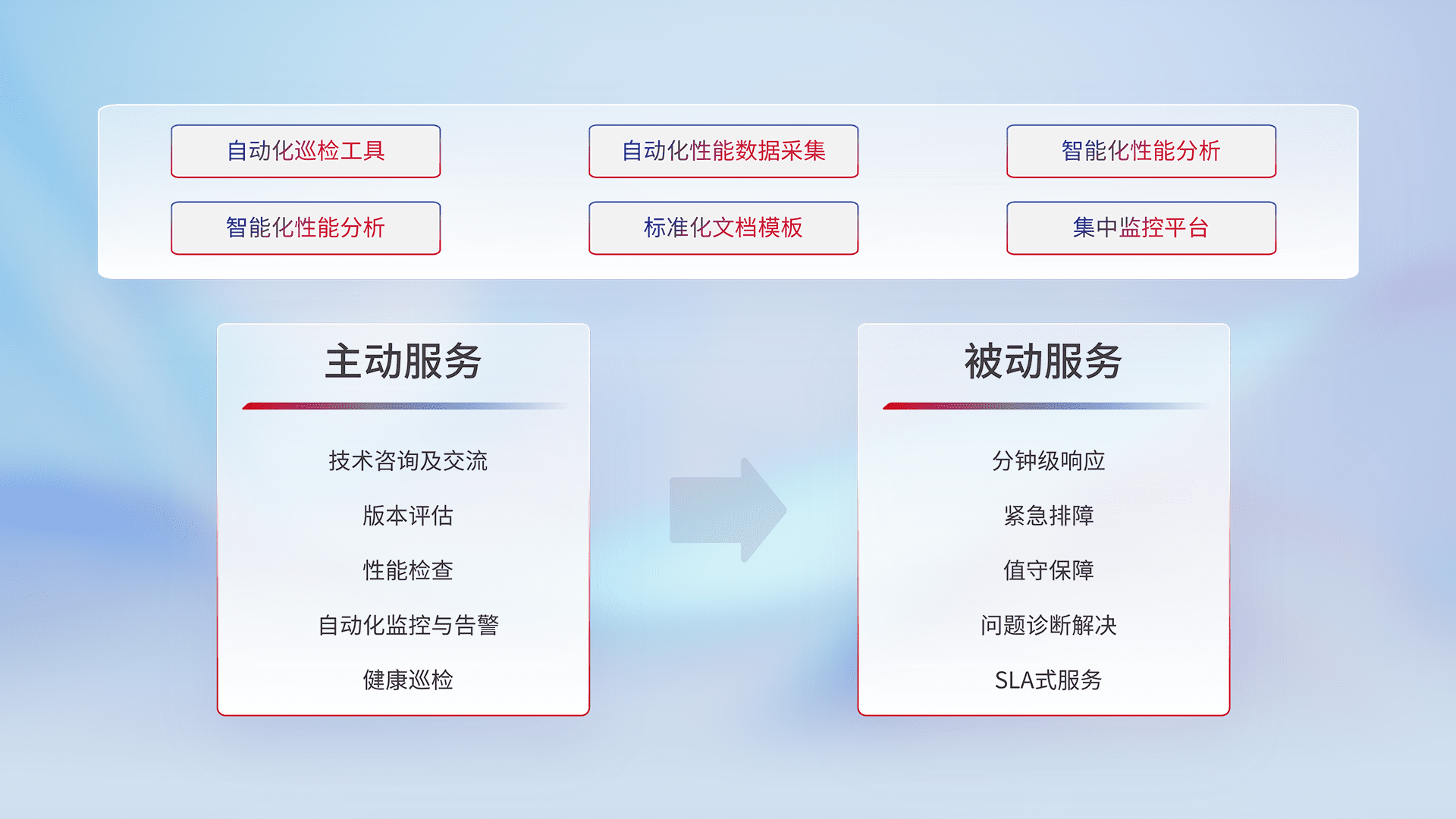 智能化工具和标准化文档,,,,保障服务质量,,,提供主动服务(包含技术咨询、、、版本评估、、、、性能检查、、、自动化监控与告警、、、、健康巡检)和被动服务包含(分钟级响应、、、、紧急排障、、、、值守保障、、、问题诊断解决、、SLA服务)。。
